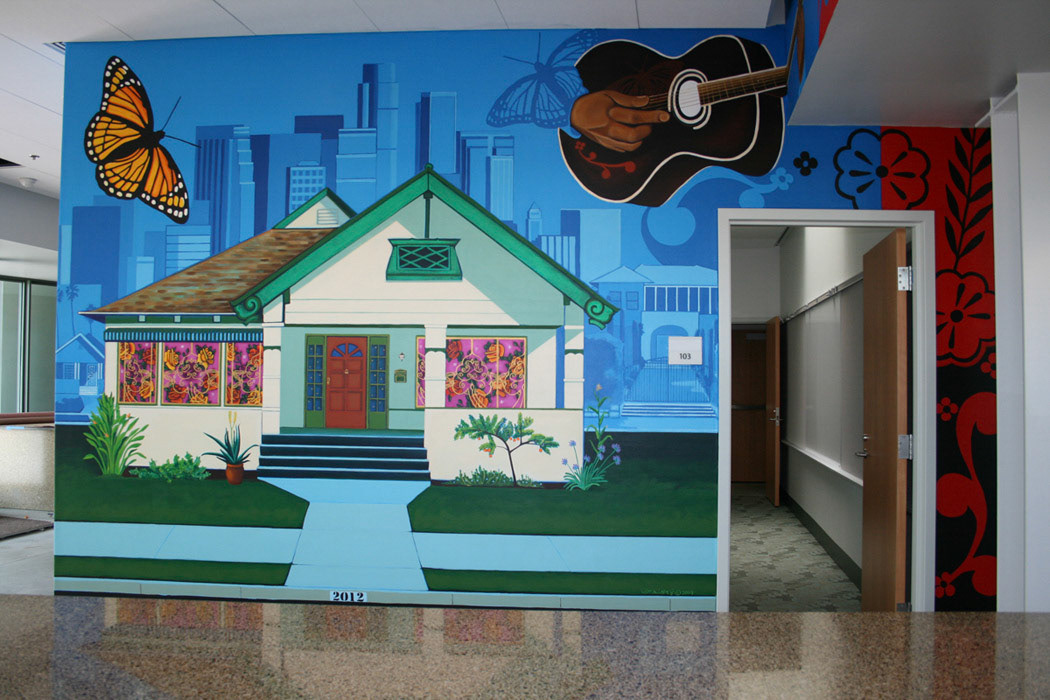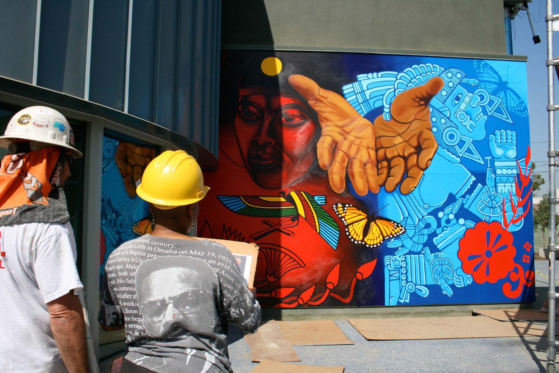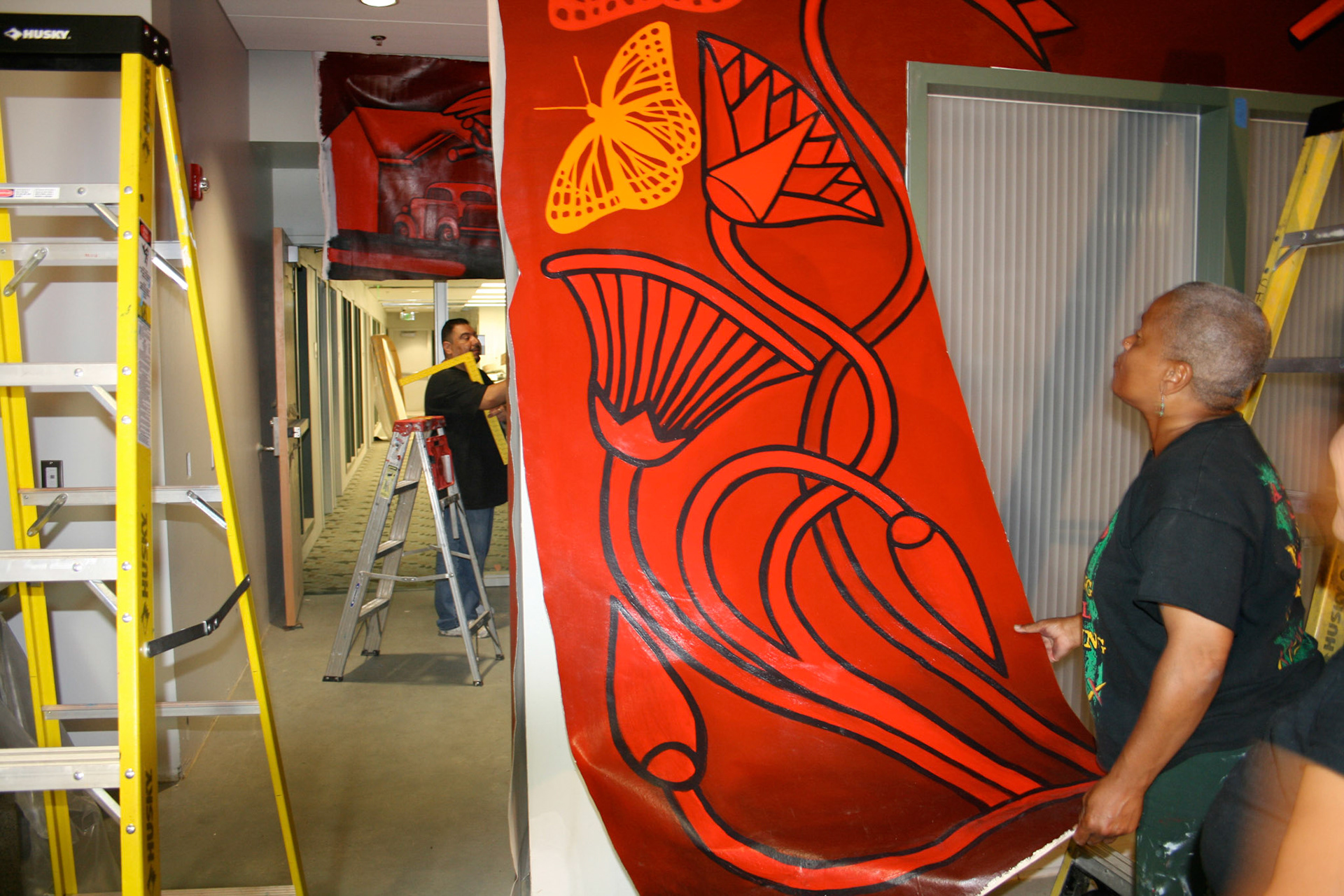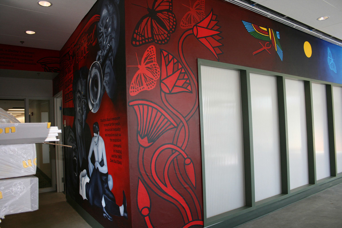 Mural projects created in collaboration with Noni Olabisi, funded by the L.A. Cultural Affairs Department, and permanently installed at the Angeles Mesa Public Library, the Central Avenue Constituent Services Center and the Gilbert Lindsay Recreation Center. All in South Central Los Angeles.