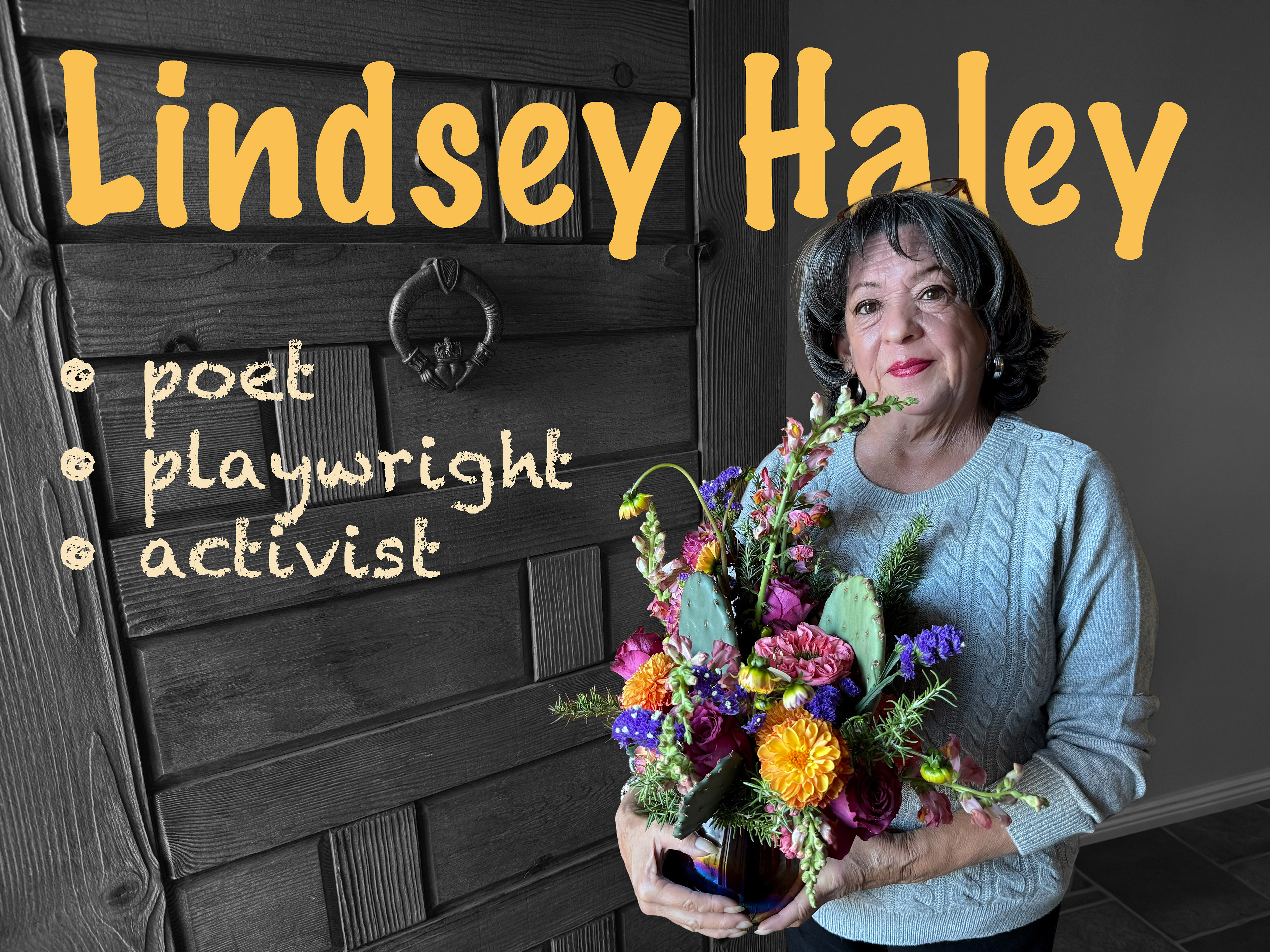 Photo of poet, playwright and activist Lindsey Haley by Alma Lopez ©2025. Photo has been edited to include text and highlight subject while rendering background in black and white.